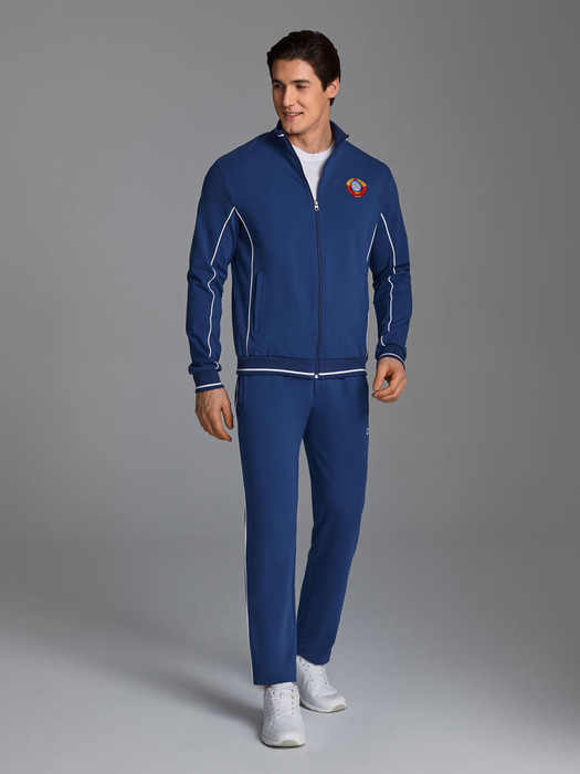 Мужской спортивный костюм из эластичного хлопкового трикотажного полотна. Куртка прямая с воротником застегивается на молнию. Рукава втачные. По передней части рукава и боковым рельефам куртки проложены белые канты. Карманы куртки прорезные, застегиваются на молнию . На груди куртки слева вышивка герба СССР, на спине куртки вышивка-аппликация СССР. Воротник, манжеты и пояс куртки выполнены из полосатого эластичного трикотажа. Брюки прямые, с прорезными карманами на молнии. В боковые швы так же вставлен белый кант. Под карманом брюк вышивка СССР. Пояс брюк эластичный, по линии талии дополнительно регулируется шнурком.