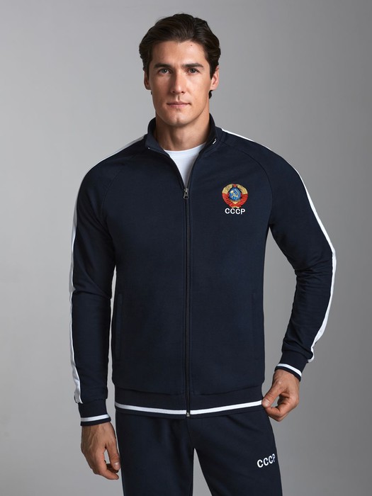 Спортивный костюм из хлопкового трикотажного полотна. Куртка костюма на поясе, с воротником, застегивается на молнию. Рукава покроя реглан. По всей длине рукава идет широкая белая вставка. Карманы на куртке и брюках прорезные с листочками на молнии.Брюки прямые. Пояс по линии талии брюк дополнительно регулируется шнуром. Слева на куртке вышивка "герб СССР", выполненная цветными шелковыми нитями. На спинке - белая вышивка-аппликация "СССР". Слева под карманом брюк так же вышивка СССР, выполненная белыми нитями.