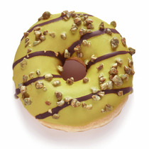 Донат с ореховой начинкой, декорированный ореховой глазурью и кусочками арахиса.