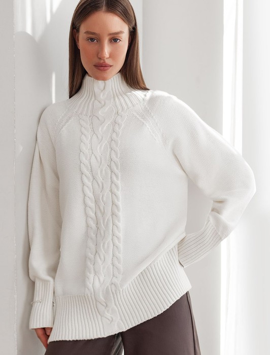 Состав: 60%Хлопок 40%ПАН (акрил) Параметры модели на первом фото: Рост 170, бюст 89, талия 63, бедра 92Свитер выполнен из мягкой хлопковой пряжи фактурной вязки с добавлением акрила. Модель связана изнаночной петлей, в сочетании с которой узор косы и высокие рибаны поддерживают ирландский стиль, который всегда в тренде. Комфортный ворот стойка хорошо защищает от ветра. Боковые разрезы поддерживают расслабленный свободный силуэт. Изделие сочетается с любым низом и не требует дополнительных аксессуаров.