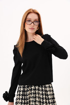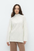 Свитшот свободного кроя, выполнен из трикотажной хлопковой ткани. Рукав втачной со спущенной проймой, низ рукава обработан довязом с нитью из люрекса, как на манжете, так и на горловине. V - образный вырез визуально удлиняет шею. Разрезные детали из контрастной расцветки выгодно создают нужные линии и зрительно вытягивают силуэт.