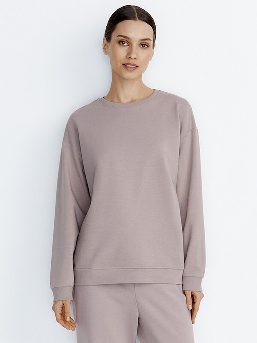 Женский свободный свитшот с длинным рукавом и круглым вырезом. Горловина обработана обтачкой из материала кашкорсе.