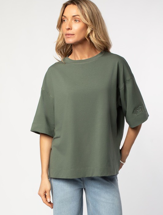 Состав: 92%Хлопок 8%ПУ Параметры модели на первом фото: Рост 170, бюст 89, талия 63, бедра 92Футболка свободного кроя выполнена из премиального хлопка. Модель дополнена вышивкой логотипа бренда на рукаве. Наличие эластана в составе изделия гарантирует комфорт и формоустойчивость. Подходит для любого типа фигуры.