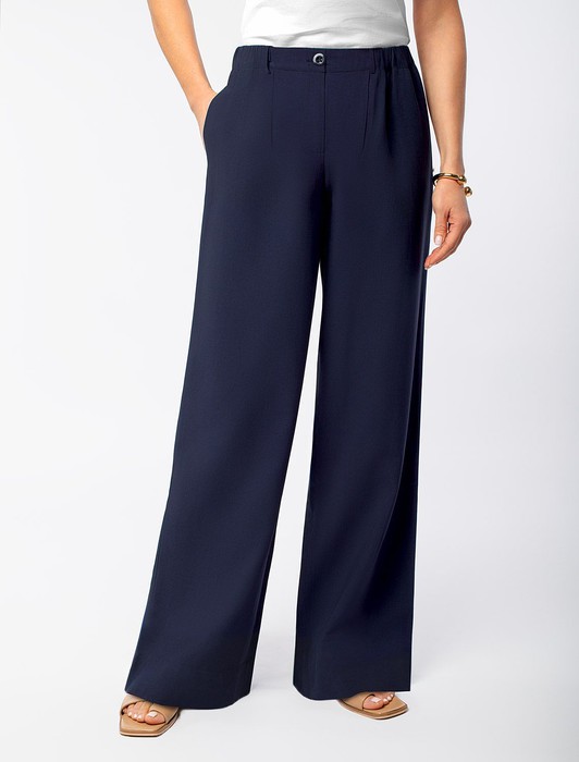 Состав: 76%Лиоцелл (Вис) 24%ПЭ Плотность: 180 Г/м2Брюки темно-синего цвета свободного кроя выполнены из плотного лиоцелла. Лиоцелл это более дорогой и экологичный вариант вискозы, очень прочный и шелковистый. Свободные прямые брюки с высокой посадкой визуально вытягивают силуэт и стройнят. Эластичный пояс на мягкой резинке гарантирует комфорт в талии и отлично сядет на любую фигуру. Удобные карманы по бокам и свободный крой делают эти брюки базовым элементом гардероба. Летние брюки отлично сочетаются с монохромным верхом, с ними можно создавать эффектные наряды как на выход, так и для ежедневных рабочих дел или простых прогулок, от делового шика до повседневного кэжуал.