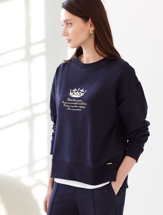 Состав: 95%Хлопок 5%ПУ Плотность: 240 Г/м2Стильный свитшот темно-синего цвета из премиального футера двухнитки с эластаном сочетает в себе комфорт и оригинальность. Джемпер выполнен из натурального хлопка, который обеспечивает мягкость и дышащие свойства ткани. Нежный материал дарит ощущение уюта в любое время года, а премиальное качество изготовления гарантирует долговечность и сохранение формы после множества стирок. Особенность изделия — спущенная линия плеча и аккуратные разрезы, которые добавляют современный акцент и делают образ более выразительным. Принт в виде надписи придает индивидуальность, позволяя выделиться без лишней вычурности. Перевод надписиThink like queen Queens are not afraid of failure Failure is another stepping Stone to greatness - Думай как королева Королевы не боятся неудач Неудача — это ещё один шаг К величию. Дополнен металлическим логотипом бренда. Представлена широкая размерная линейка, включая маленькие и большие размеры, что позволяет подобрать идеальный вариант для разной фигуры и роста. Этот уютный свитшот отлично подходит для повседневной носки благодаря своей комфортной посадке и мягкой текстуре. Он станет универсальным элементом гардероба, легко сочетающимся с различными стилями одежды. Свободный джемпер из футера станет отличным выбором для активного отдыха, обеспечивая стильный внешний вид и удобство весной, летом или в прохладную погоду.