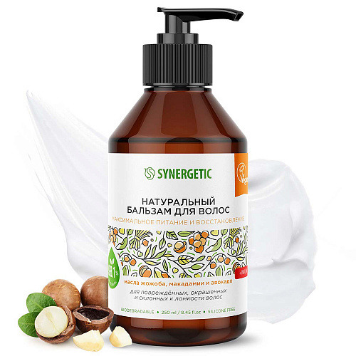 Натуральный бальзам для волос Synergetic "Максимальное питание и восстановление" — эффективное средство для ухода за поврежденными, окрашенными и склонными к ломкости волосами — более чем на 98% состоит из натуральных компонентов.