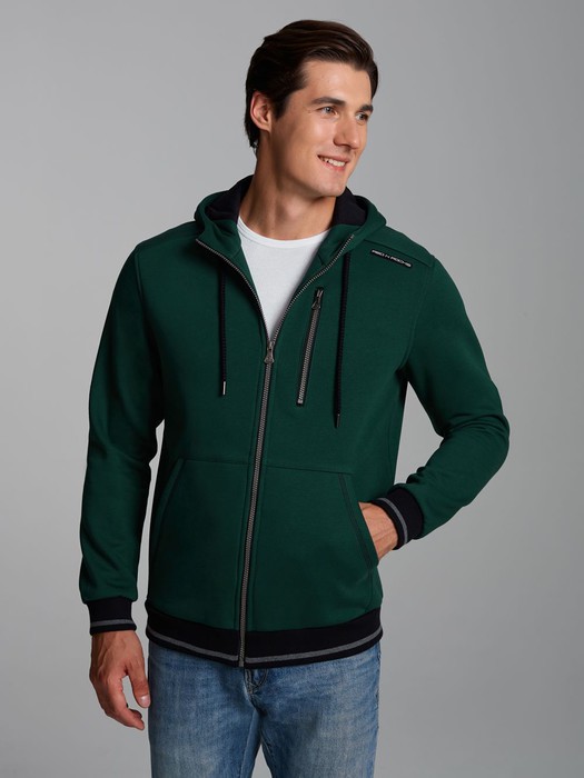 Толстовка мужская из плотного и мягкого хлопкового трикотажного полотна с изнаночным начесом. Изделие на молнии, с капюшоном, внутри капюшона - подкладка из клетчатой ткани. Спереди на изделии большие накладные карманы, слева на груди карман на молнии. По низу толстовки и низу рукавов пришита вязанная декоративная резинка.