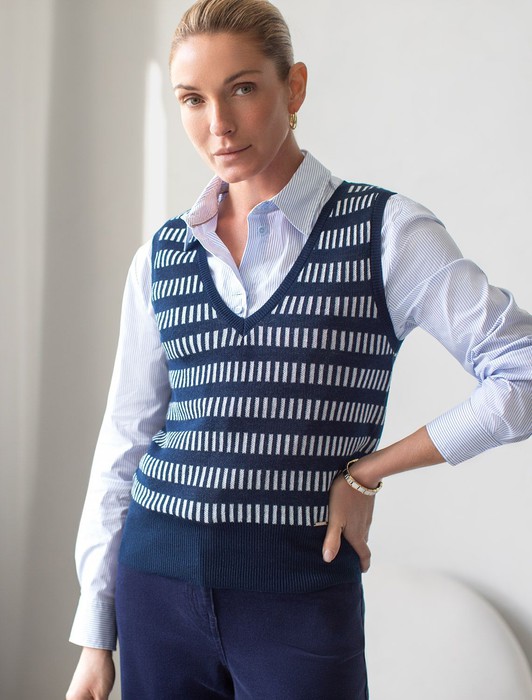 Состав: 65%ПЭ 35%Вис Плотность: 255 GGТоп из тонкого жаккарда выполнен из вискозы. Вертикальный вывязанный принт визуально стройнит и вытягивает силуэт. Добавление в состав ПЭ способствует легкости и износостойкости изделия. Мягкая пряжа приятно ощущается на теле и дарит настоящий комфорт в теплое время года. Можно стилизовать изделие в многослойных образах как жилет.