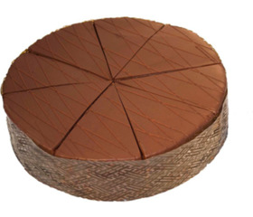 Россия. 1,2кг , 8 порций. Бисквит с какао прослоен масляным кремом с вареным сгущенным молоком и какао, глазирован шоколадной помадкой; украшен пражским кремом.