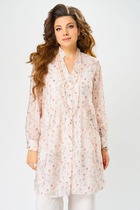 Прямой силуэт обеспечивает свободу движений, а слегка прозрачная структура ткани добавляет нотку загадочности. Втачной длинный рукав дополнен притачной манжетой с застежкой на пуговицы, позволяя регулировать длину с помощью паты. Фигурный вырез горловины, оформленный отрезными планками, и воротник-стойка создают стильный акцент, а застежка на пуговицах придает практичность.