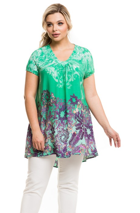 Легкая повседневная туника свободного силуэта, выполнена из штапельного полотна. Перед и спинка целые. В боковых швах расположены удобные карманы. Горловина переда и спинки с притачной планкой. По шву притачивания планки переда сборка. Рукав втачной короткий, низ рукава собран на резину. Длина рукава от плечевой точки в 48 р-ре – 12 см. в 58 р-ре – 15 см., ширина рукава по низу в 48 р-ре – 34 см. в 58 р-ре – 44 см. Низ разно-уровневый фигурный. Туника без подклада и застёжек. Длина изделия по спинке в 48 р-ре – 86 см. в 58 р-ре – 90 см.