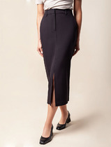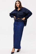 Трикотажная юбка из устойчивого полотна «джерси». Юбка-карандаш, заужена к низу. По асимметричный низ подчеркнут вышивкой «решелье» в виде стилизованного цветка с небольшими просветами вырезанных элементов вышивки.