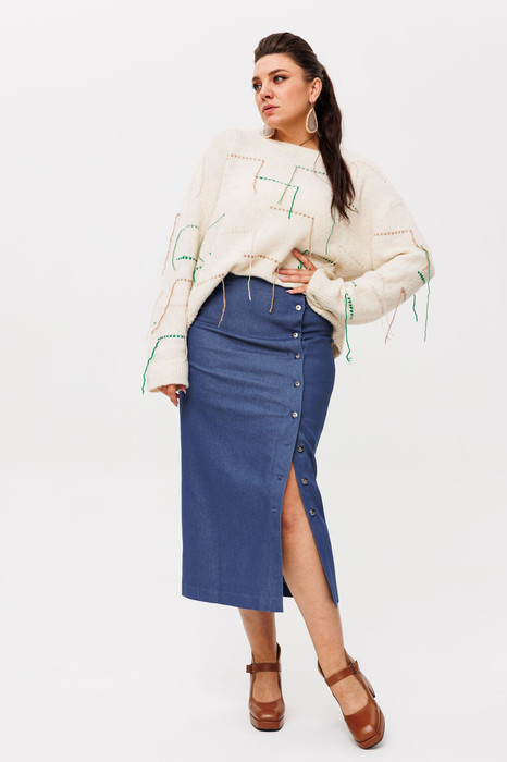 Джинсовые болты спереди позволяют регулировать длину выреза, добавляя образу уникальность и удобство. Два кармана сзади не только придают юбке стильный вид, но и обеспечивают функциональность.