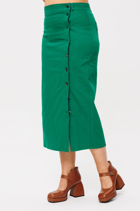 Джинсовые болты спереди позволяют регулировать длину выреза, добавляя образу уникальность и удобство. Два кармана сзади не только придают юбке стильный вид, но и обеспечивают функциональность.
