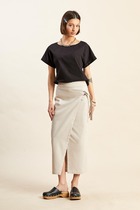 Юбка из плотной эко кожи , за счёт цвета выглядит очень минималистично.