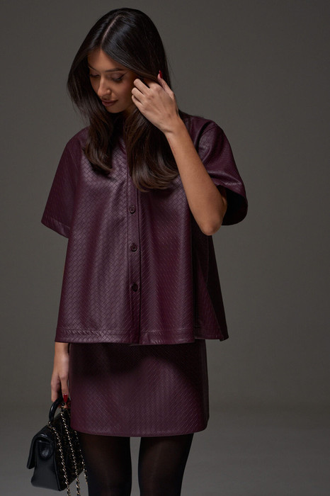 Юбка-мини. Выполнена из фактурной эко-кожи бордового цвета. С подкладкой. Силуэт - трапеция. Застёжка молния (в среднем шве заднего полотна). Длина 44 см
