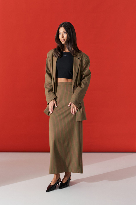 Юбка прямого кроя. Выполнена из костюмной ткани цвета хаки с оранжевой полоской. С подкладкой. Пояс стабильный. В среднем шве заднего полотна разрез (49 см). Застёжка молния в среднем шве заднего полотна. Длина юбки 96 см