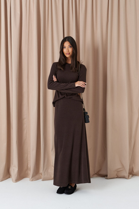Юбка свободного кроя, выполнена из трикотажа шоколадного цвета. Характеристики: свободный крой, пояс на резинке, эластичная ткань, без подклада. Длина по боковому шву 97 см.