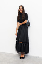 Юбка в длине макси, выполнена из струящегося синтетического шелка, форма годе, пояс обработан широкой резинкой.