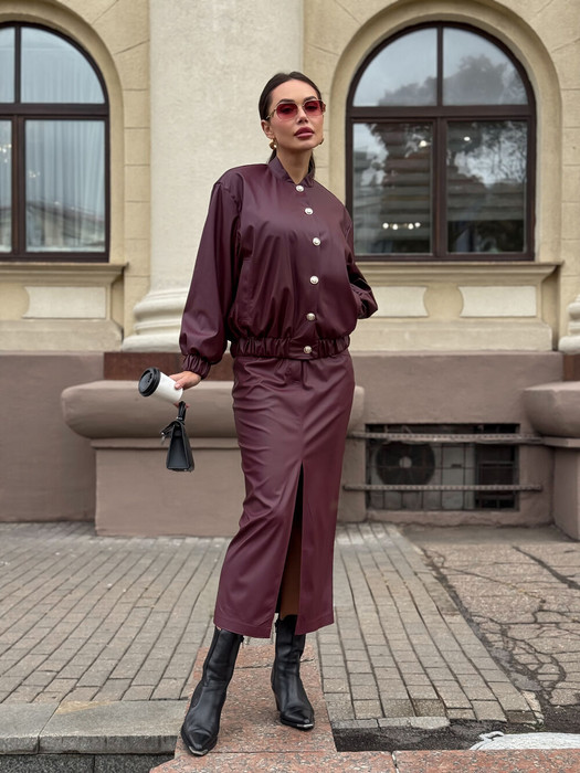 Юбка в длине миди, выполнена из эластичной синтетичекой кожи. Застёжка - гульфик с молнией, пуговица. По центру переда обработан разрез. По задним половинам настрочены накладные карманы. По переду обработаны втачные карманы.