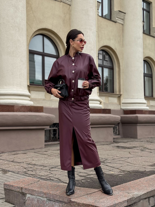 Юбка в длине миди, выполнена из эластичной синтетичекой кожи. Застёжка - гульфик с молнией, пуговица. По центру переда обработан разрез. По задним половинам настрочены накладные карманы. По переду обработаны втачные карманы.