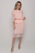 Юбка женская из текстильной ткани. На подкладке, прямого силуэта, заужена к низу. Притачной пояс-кокетка, настрочены по переду накладные карманы и обработана по центру планка, которая заканчивается шлицей. Спинка со средним швом и талиевыми вытачками. В среднем шве застежка на потайную тесьму-молнию. К юбке прилагается пояс. Длина юбки по боковому шву 68 см.