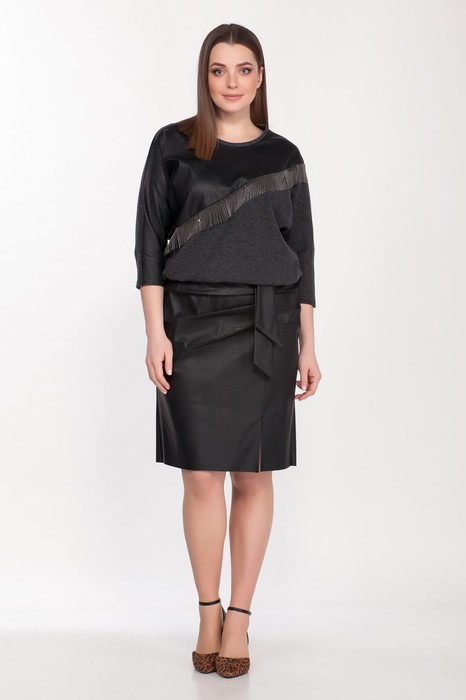 Юбка женская прилегающего силуэта выполнена из экокожи, спереди в рельефе выполнены горизонтальные складки, украшены декоративными хлястиками. Длина юбки 60 см.