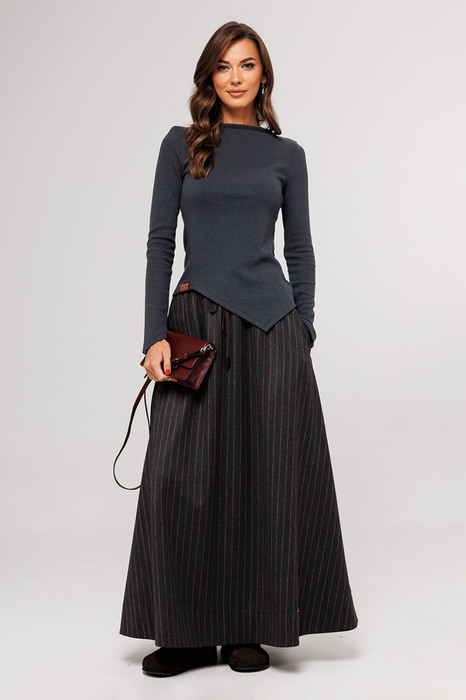 Юбка длинная из костюмной ткани А-силуэта на притачном отсроченном поясе на резинке со втянутым в него шнурком с наконечниками и карманами в боковых швах. По переду внизу нашивка "BUTER". Юбка без подкладки