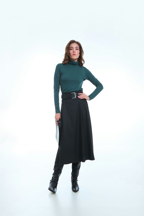 Юбка женская, классической длины, расширенная к низу. Перед и спинка со встречными складками. Низ с широкой обтачкой закрепленной отделочной строчкой. Юбка застегивается на потайную молнию по спинке. В комплекте- ремень.