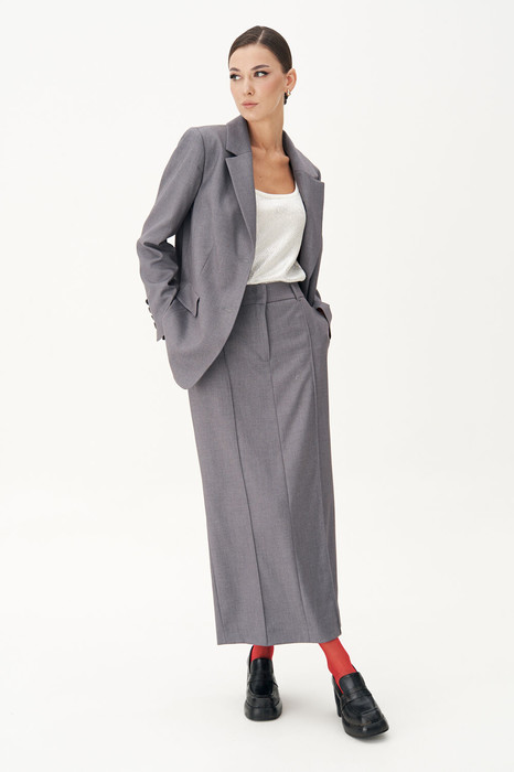 Юбка прямая, макси, на притачном поясе со шлёвками. Застёжка на брючные потайные крючки и молнию по центру переднего полотнища юбки. Также по переду юбки две складки - защипа и наклонные боковые карманы. Заднее полотнище юбки с центральным швом и шлицей, вытачками и прорезными карманами с листочками.