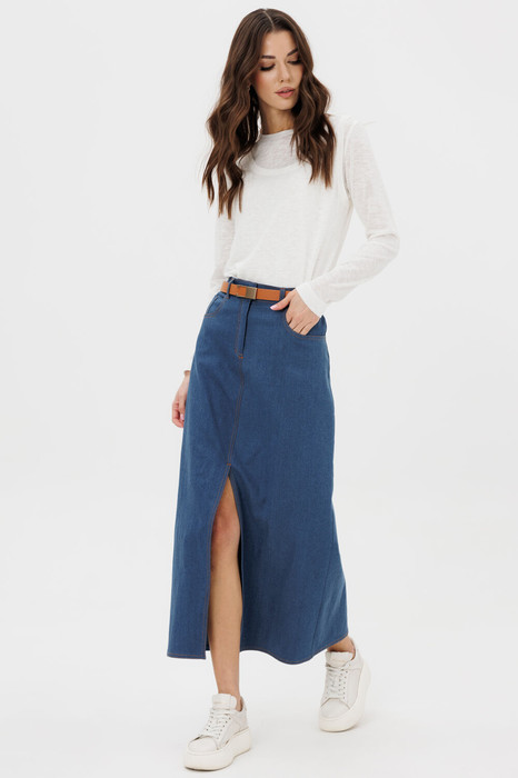 Модная джинсовая юбка-минималистичная, но эффектная! Этакий девиз современных стиляг. Сочетание длины макси с лаконичным кроем-беспроигрышное решение. Силуэт А-образный, покрой классический джинсовый. Юбка на притачном поясе со шлевками. Переднее полотнище юбки с застежкой гульфиком, разрезом по центру и боковыми фигурными карманами. Заднее полотнище юбки с отрезными кокетками, средним швом и накладными карманами.