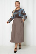 Юбка А-образного силуэта из плотного джинса. Передняя часть юбки со средним швом. С правой стороны вверху настрочен карман с клапаном- шлевкой. Задняя часть юбки со средним швом и вытачками. Сверху в среднем шве обработана потайная молния. Вдоль линии пояса настрочены шлевки. Пояс цельнокроеный на обтачке. Юбка на подкладке. Вдоль среднего шва по переду и по периметру кармана проложена декоративная строчка. К юбке прилагается сьемный ремень. Фурнитура может быть изменена с охранением художественного замысла. Длина юбки - 78 см, длина рукава - 60 см.