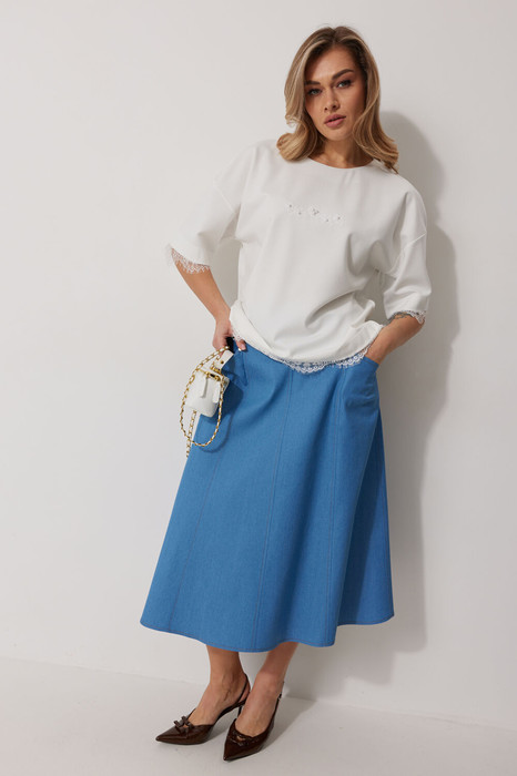 Юбка женская А – силуэта длиной до середины икры. Перед юбки состоит из 4 клиньев. Вверху передней части юбки располагается карман с отрезным бочком с хольнитенами по концам крмана. Спинка юбки состоит из 4 клиньев. Швы  всех клиньев отстрочены контрастной отделочной строчкой По среднему шву юбки находится застежка – молния.  Верхний срез юбки обработан обтачкой.
