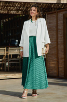 Юбка-карандаш из однотонной костюмной ткани. Модель на кокетке, дополнена шлевками под ремень. По бокам выполнены накладные карманы. В боковом шве – застежка на потайную молнию. Низ ровный, дополнен разрезом со встречными веерными складками. На подкладе.