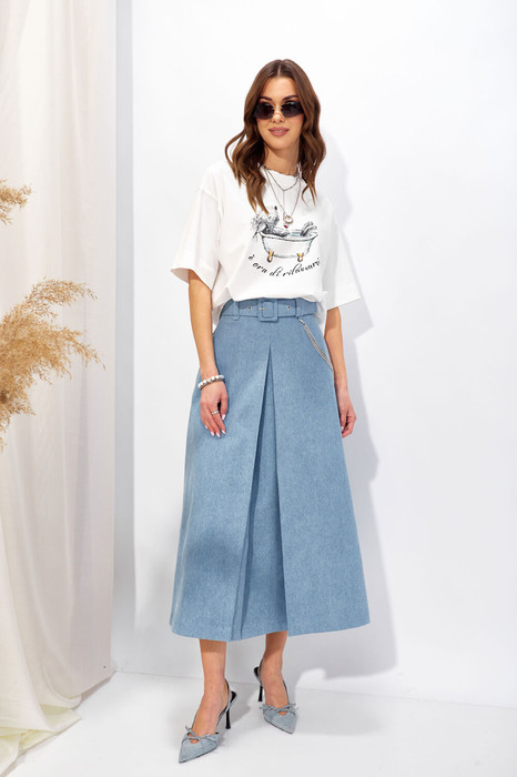 Юбка расширенная книзу из джинсовой ткани. По верху юбки притачной пояс со шлевками для ремня, на спинке застежка на потайную молнию. По переду и спинке складки. В боковых швах карманы. На спинке в  среднем шве потайная молния. В комплект входит съемный ремень. Обращаем ваше внимание, что фурнитура может отличаться от фото.