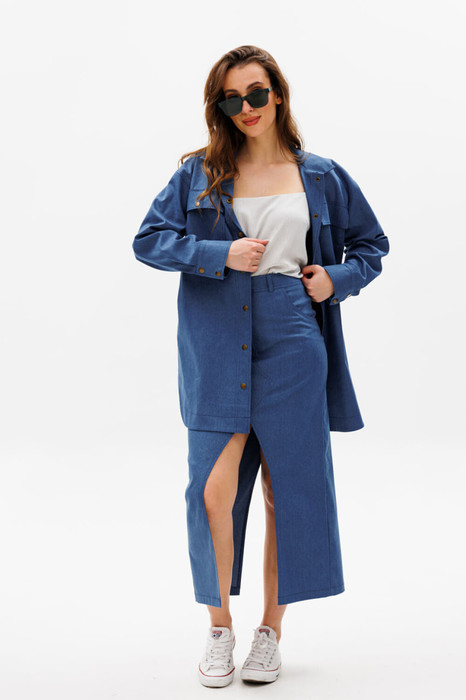 Элегантная юбка прямого силуэта длиной миди с разрезами на переднем и заднем полотнищах. Переднее полотнище с частичным запахом, имитацией боковых карманов с отрезным бочком. Заднее полотнище со средним швом, отрезной кокеткой, накладными карманами. Пояс притачной.