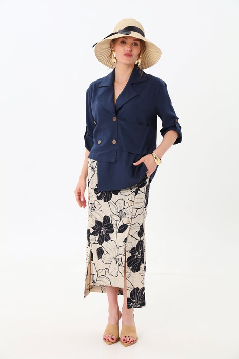 Юбка длиной миди, расклешенная к низу, с асимметричным низом. Пояс притачной, по спинке собран на резинку. Переднее полотнище состоит из трех частей. Правая часть скреплена отделочной строчкой и кнопками. В боковых швах изделия расположены карманы. По спинке изделия идёт средний шов и две вытачки для удачной посадки по фигуре. Юбка без подкладки.