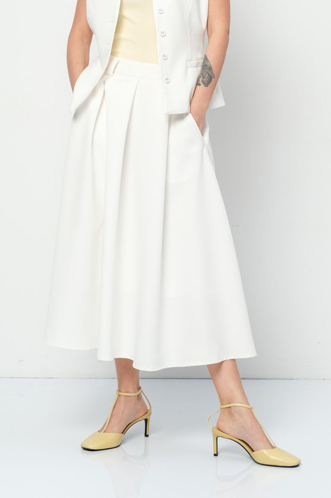 Детали: юбка на притачном поясе со шлевками, прорезные карманы, застежка на потайную молнию в левом боковом шве, на подкладке.
