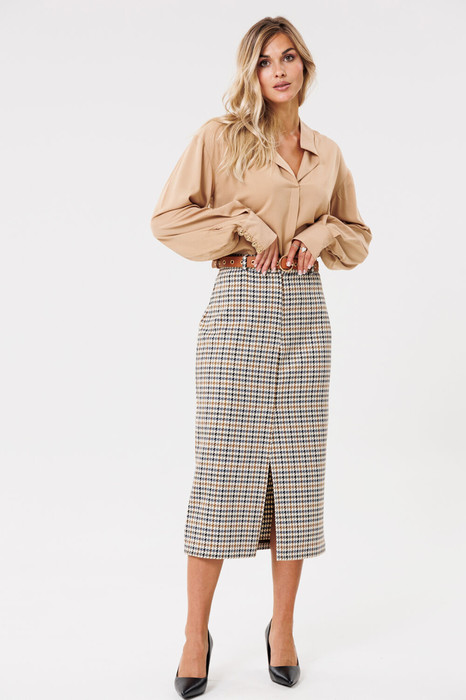 Промеры на примере 42 р.: Длина юбки по боковому шву с учетом пояса 81 см, ОТ - 74 см, ОБ - 92 см. Длина шлицы 47 см.