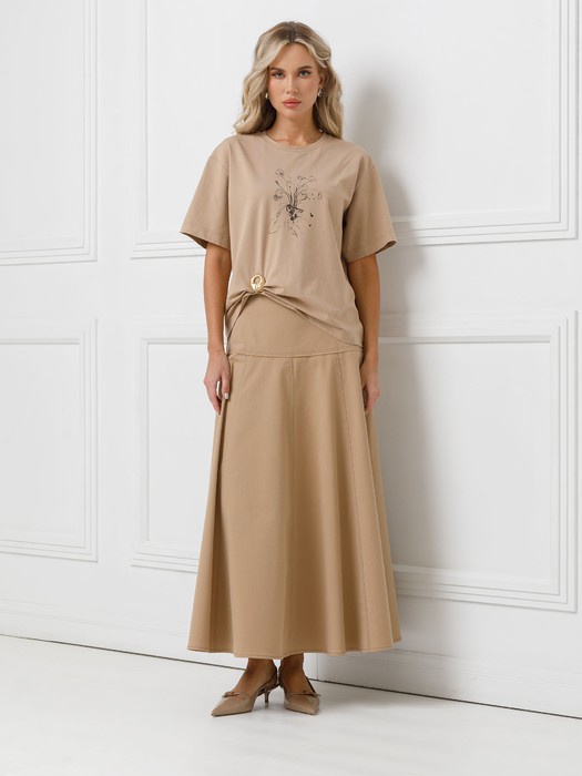 Модель на широкой кокетке, без подклада. В левом боковом шве потайная застёжка молния. Юбка декорирована швами с открытыми срезами и отделочными строчками.
