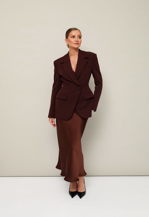 Юбка с кроем «по косой» в длине миди, пояс на обтачке, застежка в боковом шве на потайную тесьму молнию.