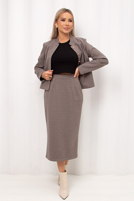 Юбка - карандаш прямого силуэта из утепленного костюмного трикотажа в ёлочка. Модель с комфортной посадкой по талии, которую обеспечивает резинка по спинке. По среднему шву спинки застежка на потайную молнию. Низ ровный, сзади разрез.