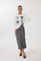 Юбка миди из джинсовой ткани. Верх на поясе со шлевками. Застежка по переду на кнопки. В боковых швах карманы. По переду кокетка и планка, переходящая в разрез. По спинке кокетка и карманы с клапаном. На клапане застежка на кнопку. Длина 85 см.