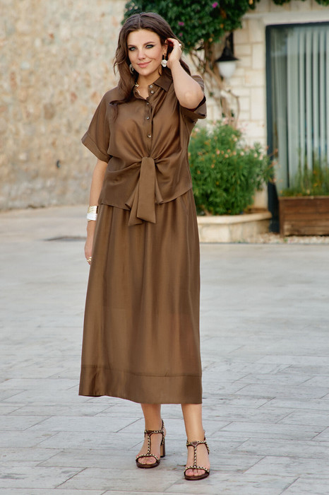 Юбка-трапеция из полупрозрачной ткани — это воплощение летней легкости и грации, ее силуэт расширяется от узкой линии талии мягко расходится к подолу, создавая воздушный объем, который танцует при каждом шаге. Ее полупрозрачность и благородный цвет позволяют создавать образы от нежно-романтичных до смело-городских. Ключ к успеху — баланс: воздушность юбки уравновешивается более структурированным верхом, а теплый шоколадный оттенок становится идеальной базой для любых цветовых акцентов. Юбка трапециевидного силуэта. Её форма одновременно структурирована и свободна: чёткие линии кроя сочетаются с текучестью материала. Длина юбки — до середины икры или чуть ниже, позволяя демонстрировать изящные лодыжки и удобную летнюю обувь. При ходьбе юбка образует красивые волны, её полы расходятся, обнажая мгновениями ногу, чтобы тут же снова сомкнуться в элегантном движении. Пояс в юбке притачной, на эластичной тесьме-резинке, что обеспечивает максимально удобную посадку на любой тип фигуры, по низу притачная деталь в сгиб в виде планки. Юбка на подкладке. Длина юбки 87 см.