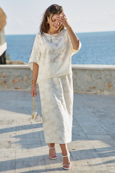 Юбка А-силуэта молочного оттенка с фактурным принтом — это выбор женщины, которая: ценит элегантность в движении — а не статичную красоту, любит тактильные ощущения — наслаждается прикосновением ткани, предпочитает мягкую женственность — без агрессивных линий, обладает вкусом к деталям — замечает красоту в текстурах, не боится быть заметной — но делает это изящно. В мире, где часто приходится выбирать между комфортом и стилем, эта юбка предлагает и то, и другое — свободу движения и утончённость линий, практичность кроя и художественность фактуры. Это не просто предмет гардероба — это заявление о подходе к жизни: можно быть одновременно и сильной, и нежной, и современной, и романтичной, и простой, и сложной. Юбка длины миди — это воплощение элегантной непринужденности. Она опускается ровно до середины икры, открывая изящные щиколотки. Юбка расклешенная, длины миди с притачным поясом со вставкой эластичной тесьмы-резинки в бочках. По спинке юбки застёжка на потайную молнию и пуговицу в поясе. Юбка на подкладке. Длина юбки 84 см.
