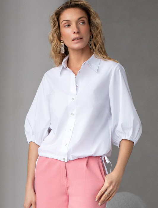Состав: 77%Хлопок 20%ПЭ 3%ПУ Плотность: 96 Г/м2Укороченная блузка белого цвета из эластичного хлопка идеальна на весну и лето. Смешанный состав ткани идеален для деловых блузок: хлопок приятен к телу, полиэстер повышает долговечность, ПУ (эластан) придает комфортную растяжимость. Стильная модель с пышными рукавами буфами создает эффектный и женственный образ, который подойдет как для деловой работы, так и для повседневной носки. Блузка дополнена пуговицами из натурального перламутра — это экологичная долговечная фурнитура с уникальным сиянием. Практичная кулиска по низу держит форму изделия, подчеркивая талию и создавая аккуратный силуэт, а так же позволяет регулировать посадку, добавляя функциональности и удобства. Благодаря сочетанию качества материала и продуманного дизайна, рубашка хорошо сидит и на больших размерах, обеспечивая комфорт и свободу движений. Короткие рукава фонарики придают образу модный акцент, делая его более выразительным и динамичным. Натуральная ткань гарантирует комфорт и воздухопроницаемость, что особенно важно в теплое время года.