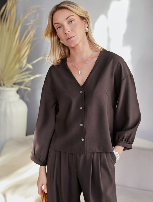 Состав: 92%Лиоцелл (Вис) 8%ПЭЭлегантная укороченная блузка кофейного цвета выполнена из плотного лиоцелла. Лиоцелл это более дорогой и экологичный вариант вискозы, очень прочный и шелковистый. Ткань отличается от регулярной коллекции из лиоцелла - она содержит еще больше лиоцелла (92%), благодаря чему имеет более нежную шелковистую фактуру. Модель дополнена объемными рукавами длиной 7/8, создающими модный акцент. Укороченная передняя часть блузки выгодно подчеркивает линию талии, а удлиненная спинка обеспечивает комфорт. Этот асимметричный фасон придает образу динамичности, а V вырез визуально вытягивает силуэт. Свободный крой романтиной блузки не сковывает движений и отлично садится по фигуре даже на большие размеры, скрывая возможные недостатки. Эта легкая блузка с застежкой на пуговицы идеальный выборо для комфорта и стиля в теплое время года, она идеально адаптируется под любой повод.