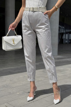 Стильные женские брючки на поясе с завышенной линией талии. Модель прямого кроя, на поясе — молния с клепкой, по бокам вшита резинка, имеются два боковых кармана.