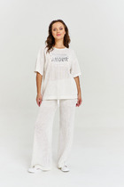 Стильные женские брючки на поясе с завышенной линией талии. Модель прямого кроя, на поясе — молния с клепкой, по бокам вшита резинка, имеются два боковых кармана.