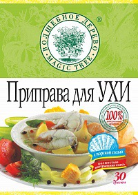 В данную приправу входят все пряности, необходимые для приготовления ухи. CОСТАВ: Соль морская, лук, перец черный, морковь, лавровый лист, чеснок, корень петрушки, перец душистый, петрушка.